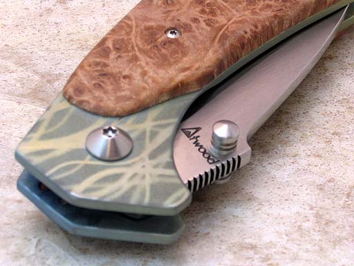 This is a beefy tool! I used just shy of 1/8" stock for the ti framelock and gave it a wild anodizing job, 5/32" thick satin finish blade of CPM 3V for extra durability, hardened 440C pivot and stabilized maple burl overlays.